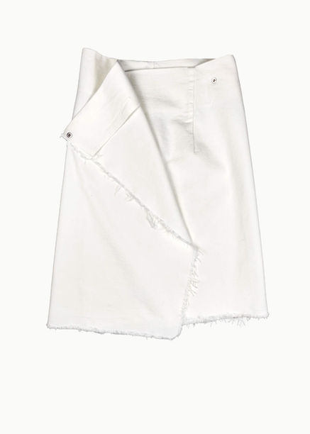 Jupe portefeuille asymétrique avec fermeture boutons pression et coutures effilochées.